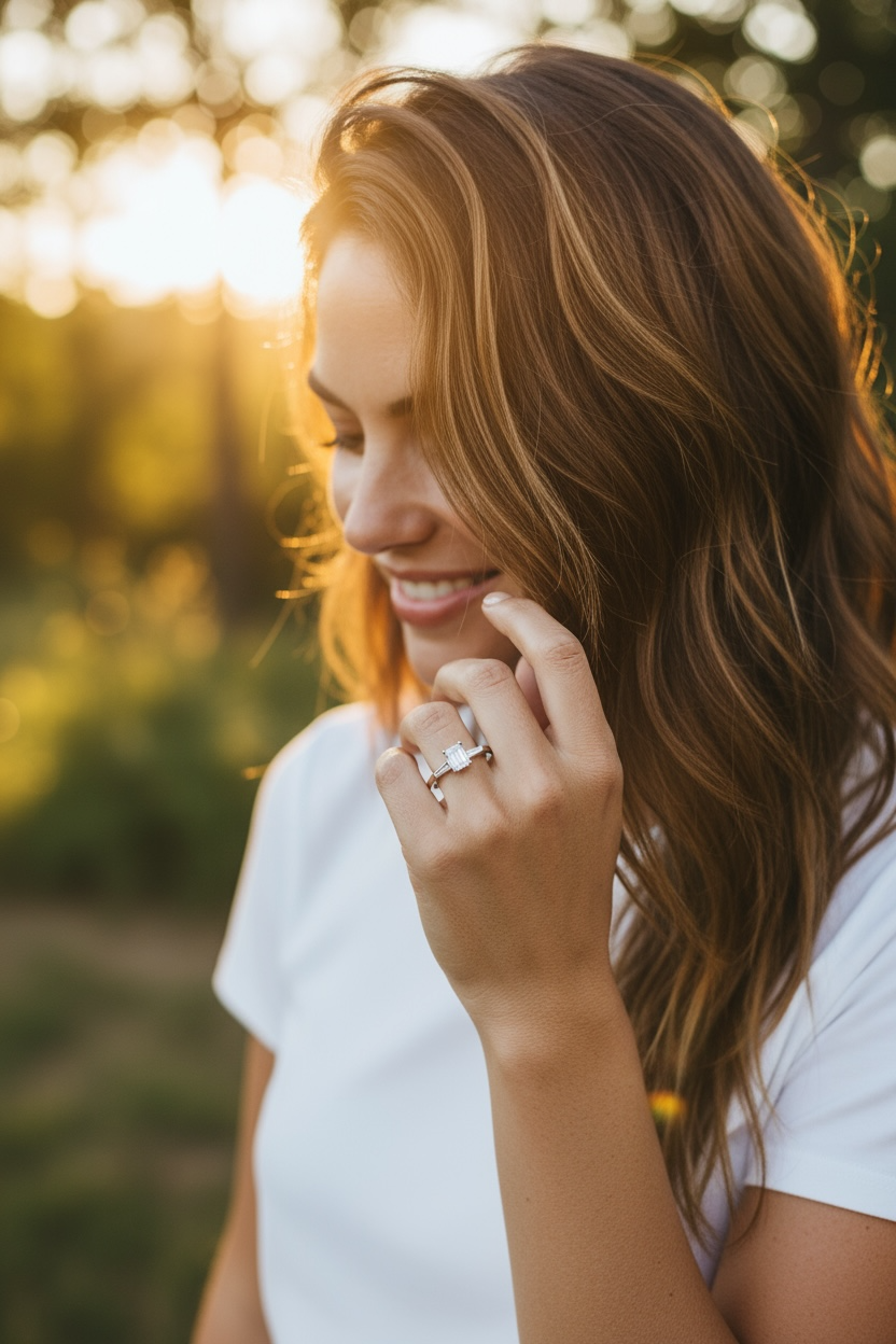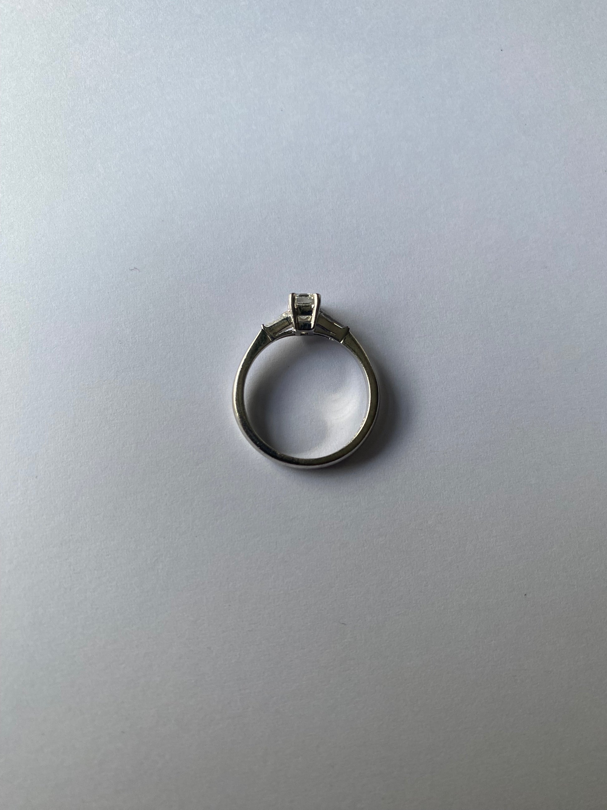 Pure simple elegance. This ring has a single emerald cut diamond weighing .70 carats flanked by a pair of single tapered baguette cut diamonds to each shoulder set in platinum.