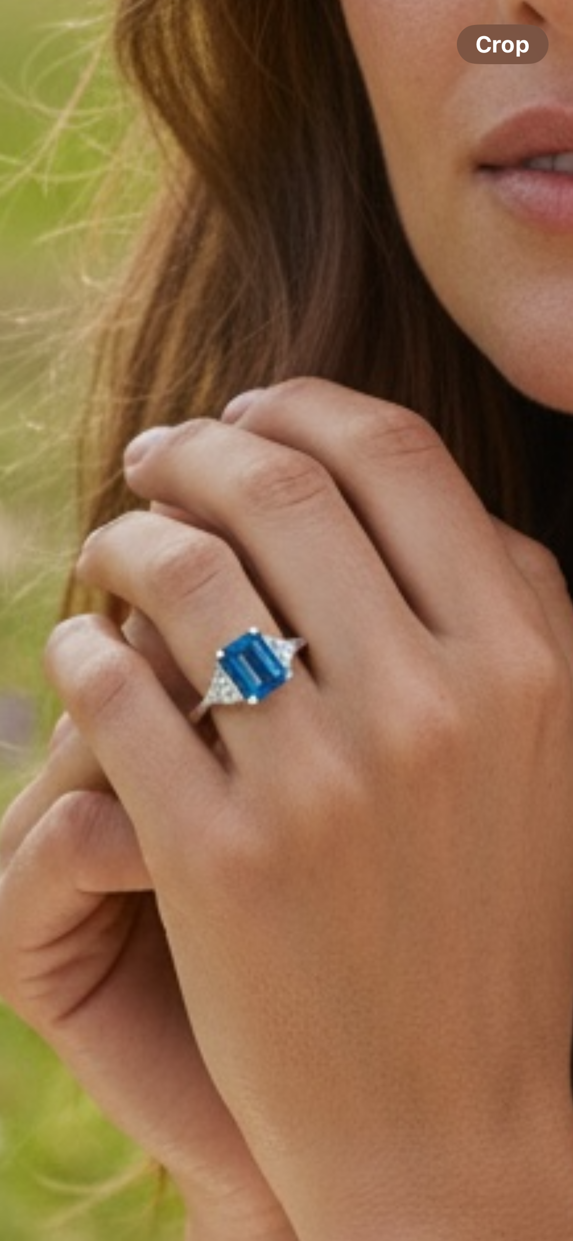 A very elegant emerald cut aquamarine mounted with a pair of trilliant cut diamonds in platinum as a three stone engagement ring