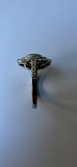A most attractive oval Ceylon sapphire and brilliant cut diamond double cluster ring set in platinum with four diamonds to each shoulder